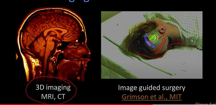 These are screenshots taken from Siemens sells a system for doing port monitoring.Just to know whether, say, people are loitering, or vehicles are approaching that aren’t supposed to be. This is also a computer vision. A more direct effect on a single individual with computer vision is work in medical imagining. Okay, so here you see an example. There’s all sorts of 3D imaging, MRI, CAT scan, stuff like that, but here you see some work.This came out of Eric Grimson’s lab a while ago at MIT where on a screen, a the computer vision system is registering the skull that’s on the table with a model that has been created from the 3D imaging. So while, when the surgeon looks at this monitor, he sees the real person, and by the way, if there were a scalpel here, he’d see the hand with the scalpel or drill or whatever you’re using to make a hole in the person’s head. And where the various structures are underneath that you wanted to see, and that’s also computer vision.