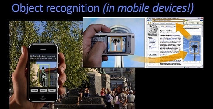 It’s, the computing power has gotten smaller. And it allows us to now operate in smaller packages. So, there’s this whole area of augmented reality and object recognition by mobile devices.So, here’s a system of where you, you’re showing it a picture of this statue.It recognizes who this is and what the monument is. And here’s an old picture from Nokia, where you can actually go off to the web, pull out information and display it to you. So for a while we were talking about doing this on smart phones, now it sits on your face. This is Professor Thad Starner, a Georgia Tech professor as well. He was instrumental in the developement of Google Glass. And one of the things that Glass does is you’ve got a camera looking out of what you’re seeing. And can, through the same object recognition methods, can give you information about what you’re looking at. And this is also part of computer vision [2].