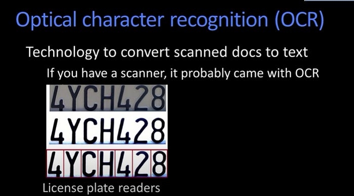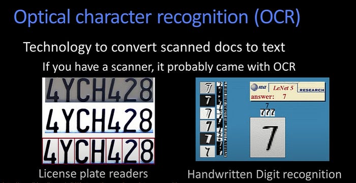 The interesting question is sort of what is the state of the art in computer vision now? What are things that are people doing with computer vision? How might that compare a little bit to the way humans do vision? Here is a, a simple example of stuff that, in fact used to be sort of considered to be difficult, but is actually now pretty standard. So let’s talk about simple optical character recognition. So here’s an example from some license plate readers. And license plates are somewhat easier because there’s a fixed font. In fact, not that long ago doing OCR was considered very hard. Today if you have a scanner, or if you have Adobe Acrobat, it comes with OCR built in. Because that’s how ubiquitous and sort of easy it is. A little more challenging, many of you may have started using automated teller machines. Where you can deposit bank checks with hand written numbers that are the amount. And also, for quite a while the Post Office has been recognizing the ZIP codes using, machines. Again, on handwritten envelopes. So that’s an example of computer vision extracting the meaning. What are the numbers that are there? [2].