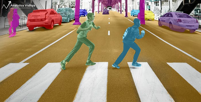 Image segmentation is a method of dividing a digital image into subgroups called image segments, reducing the complexity of the image and enabling further processing or analysis of each image segment. Technically, segmentation is the assignment of labels to pixels to identify objects, people, or other important elements in the image. In the figure below, the image was segmented such that each instance will be given a certain color, as shown [1]: