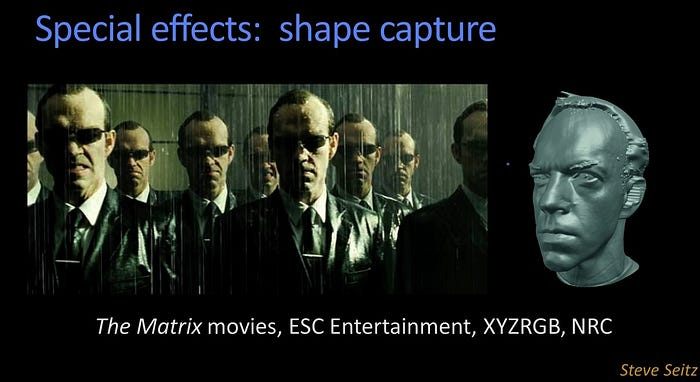 Special Effects and 3D Modeling: There’s a area of computer vision people know a little bit less about. It’s used a lot in special effects, everything from capturing the shape of somebody, so you take the scan of somebody’s face, whether it’s laser or otherwise. You build models, and then you can make lots of these people, and you can light them from different sides and different directions because you have a full 3D model.