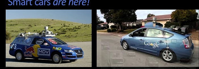 And in fact, smart cars are here. So this car, some of you know, that is Stanley. Stanley was the Stanford. That’s the little red S there. Entry into the Urban Grand Challenge run by DARPA. And it was started by. Stanley was run by this guy. What’s his name? Oh yeah, Thrun something, I don’t know Sebastian. He’s the guy who also started Udacity. He’s sort of a way under achieving, no ambition kind of guy. They won that. And then Sebastian, because he’s just out there,