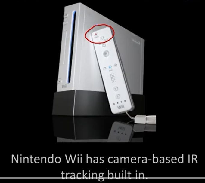 Something else that has really changed lately, is the pushing of computer vision down into video games.So one of the first places to do that was the Nintendo Wii. The remote control, there’s actually a camera system built right into here, that tracks the two dots that are from the sensor bar and reports that information.