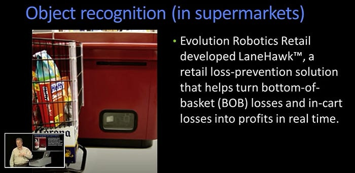 here is this company, Evolution Robotics, that had developed this thing called Lane Hawk, which basically prevented some of you. None of you. From putting stuff on the bottom of a basket and then wheeling it out and forgetting to mention to the cashier that it was there. This is actually a huge problem. And the system, you can see the camera here [2].