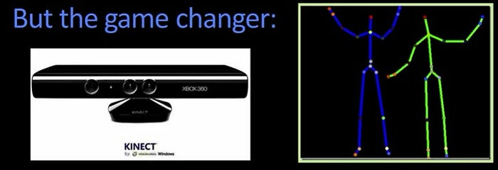 The important thing about a Kinect is that it can produce skeletal descriptions. Using a combination of machine learning techniques applied to computer vision, the folks at Microsoft and this came out of Microsoft Cambridge in the UK. Were able to recover the skeleton geometry of people from the depth image. And by the way, they do it instantaneously. Every frame, they do it differently. They don’t even track it, they just do it one frame at a time. It’s that robust.